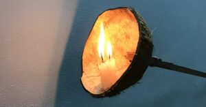 নারকেল মালার টর্চটা তবে বেশ অদ্ভুত। চোখওয়ালা নারকেল মালার চোখের ভেতর পাটকাঠি ঢুকিয়ে হাতল বানিয়ে নিয়ে সামনে একটা মোমবাতি বসিয়ে নিলেই টর্চ তৈরি। অন্ধকারের ভয় তখন শত হাত দূরে। তবে পুজোর দিনটায় আলাদা কোন অনুষ্ঠান হত না। সবাই সন্ধ্যায় পাটকাঠির মশাল জ্বালিয়ে “ধা রে মশা ধা লাল বন কে যা •••••” গাইতে গাইতে হাতে ধরা মশালটাকে বন বন করে ঘোরাতে ঘোরাতে এগোত কালীতলা অবধি। ফেরার পথে যার যা সংগ্রহ সব বাজি ফাটাতে ফাটাতে বাড়ি।অবশ্য কৌটোবোমা ফাটানো হত দিনের বেলা। বাড়ি ফিরে খাওয়া সেরে ঘুমিয়ে পড়তাম।