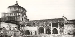 ছবিতে আলোছায়ার অদ্ভুত খেলা। এমনভাবে যীশুর ওপর আলো পড়ছে যেন মনে হচ্ছে তাঁর মাথার চারপাশে একটা হ্যালো। জানতে পারলাম এই ঘরটির ছাদ নাকি একদা ট্রান্সপারেন্ট ছিল। তাই তো বোধহয় বললেন! মোদ্দা কথা ছাদ দিয়ে আলো আসত যাতে ছবির আলোছায়ার খেলা আরো স্পষ্ট হয়। দ্বিতীয় বিশ্বযুদ্ধের সময় মিত্র শক্তির বোমায় সব নষ্ট হয়ে যায়। আলো ঢোকার রাস্তাও, কারণ তারপরই ছাদ দেওয়াল সব নতুন করে তোলা হয়। ধ্বংসের একটা ছবিও দিলাম, ১৯৪৩ সালের যুদ্ধের সময় তোলা।